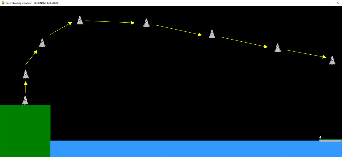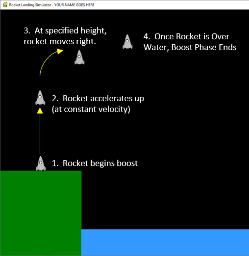 At the start of the simulation, our rocket is sitting at rest on the ground. It then begins to take off (Step 1, Above) and continues to accelerate using its thrusters until it is at some preprogrammed height (e.g., Step 2 - 1/2 the screen height). Once this happens, the rocket begins thrusting to the right until it is over the water (Step 3). Finally (Step 4), the rocket stops boosting and starts falling to the ground.