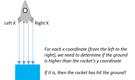 The second end condition (i.e., landing/crashing) is a little more complicated. We need to check underneath the rocket to see if any part of it is touching the ground. To better understand why we can't just look at a single coordinate, look at the following picture: