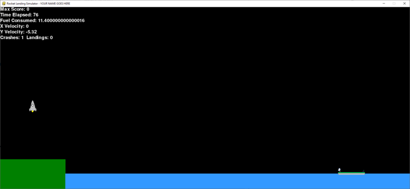 For this PEX, the fuel consumed will represent the total amount of thrust that applied to the rocket over the course of the simulation run. This value should start at 0 at each simulation run, and increment each time the player chooses to accelerate in the left, right, or up directions. For example, if the user decides to accelerate 0.3 in the right direction for one frame, and 0.3 in the left direction the next frame, the total fuel consumed would be 0.6 (0.3 + 0.3 = 0.6).